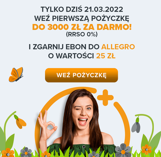 Promocja dla nowych klientów Pożyczka Plus na powitanie wiosny! Tylko w dniu 21.03.2022 każdy nowy klient, który skorzysta z pierwszej pożyczki otrzyma bon o wartości 25 zł na zakupy do Allegro! W paczce poniżej dwie kreacje mailingowe: Pobieram kreację Regulamin konkursu